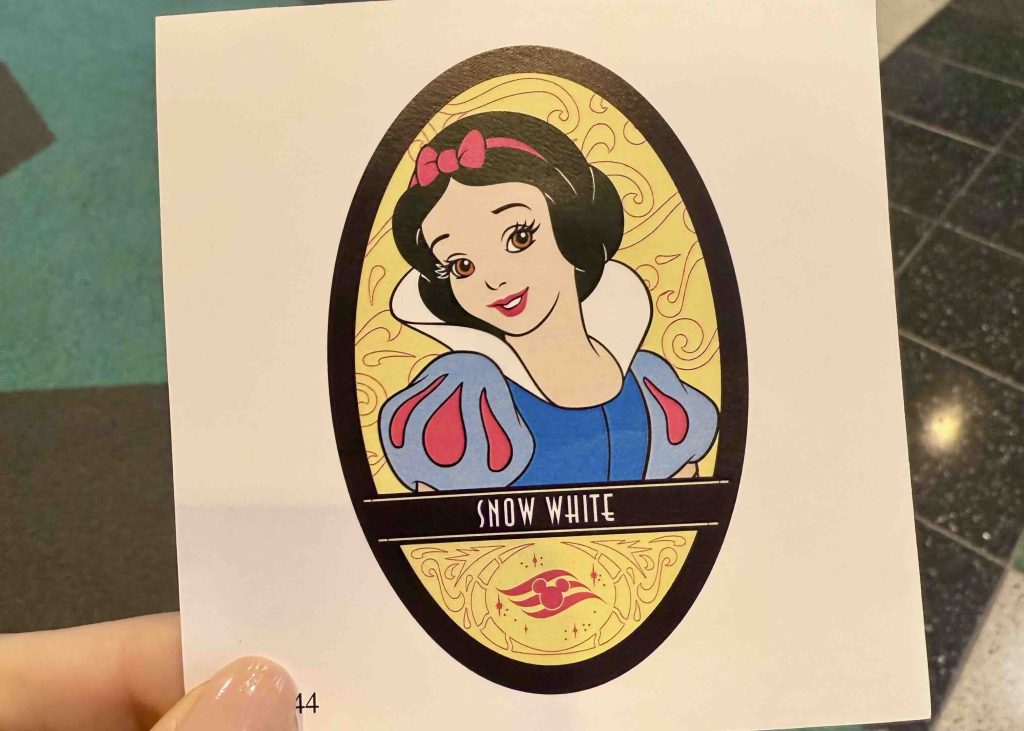 ディズニークルーズのキャストさんに名前を伝えて受付完了すると、白雪姫の紙を渡されました。この日はバスが2台あったので、白雪姫のグループと、別のキャラクターのグループの2グループありました。