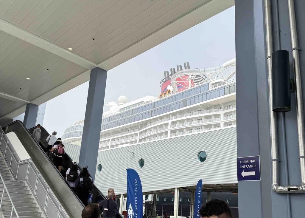 ウィッシュ号の発着は、ミッキー型の入り口があるターミナル8ではなく、ターミナル10からの乗船でした。大きな船を眺めながら、エスカレーターを上ります。