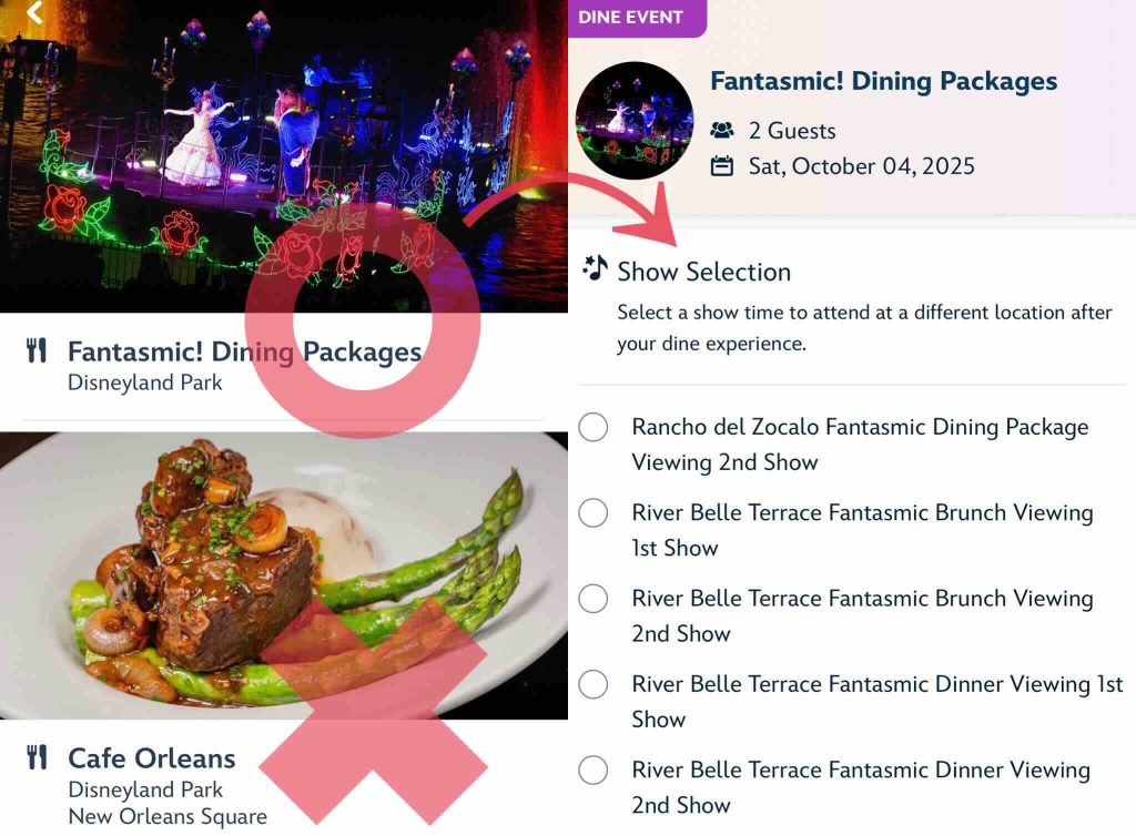 レストラン名で検索すると、通常のレストラン予約になるので、「Fantasmic! Dining Packages」で検索すると予約ページに行けます。ここから、対象のレストランを選択します。