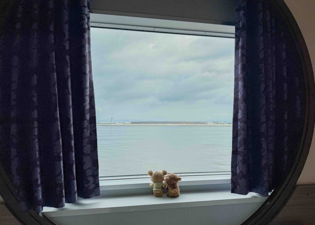 フェリーのお部屋の窓から、万博会場の大屋根リングが見えて感動!