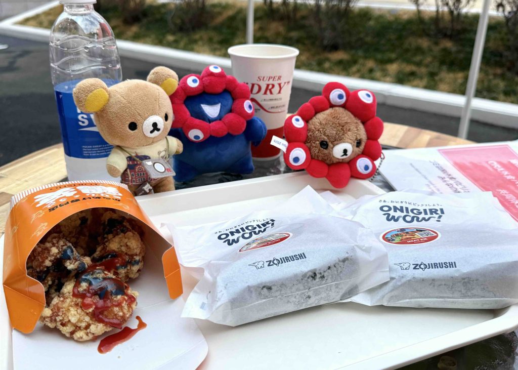 お昼に唐揚げとおにぎりをいただきました!象印のおにぎり屋さんには、海外をイメージした具材のおにぎりもあって、くまくんはオーストラリア、みみはベトナムのおにぎりにしました♪