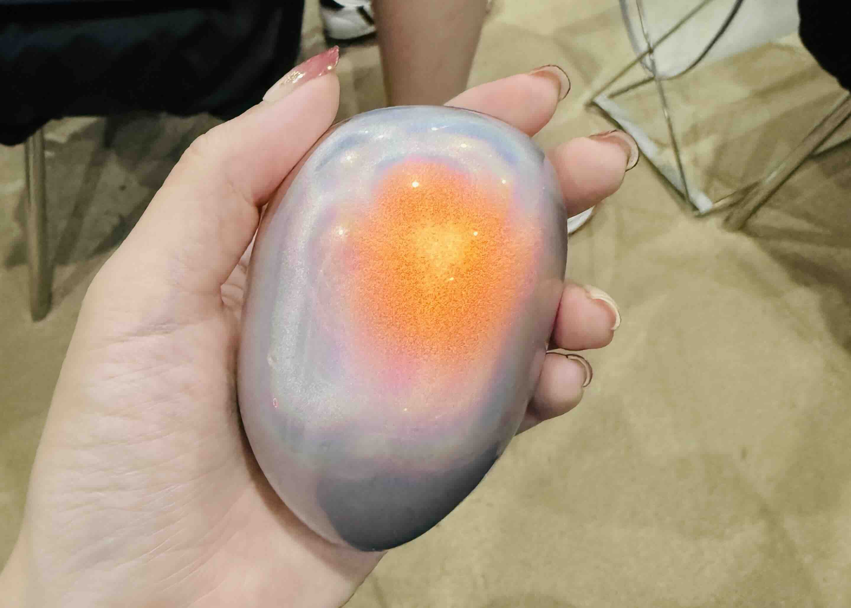 受付すると、echorb(エコーブ)という握りこぶし大の石のようなアイテムを渡されて、スマホと同期します。石を手に持っていると、自分の心拍数を反映したり、音がしたり、引っ張られるような感覚になったり、不思議な石でした~!
